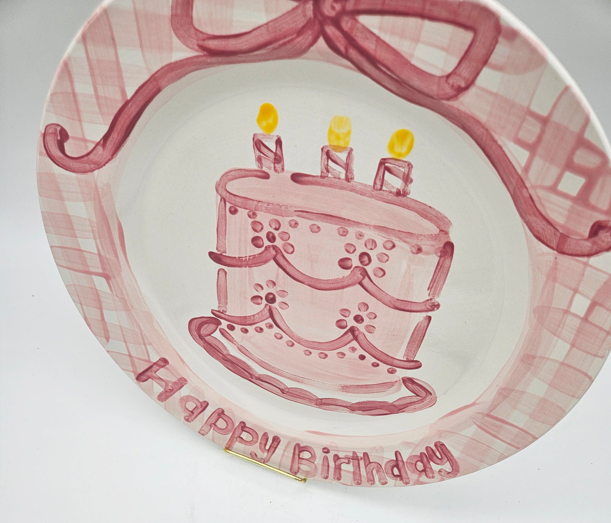 Pink Gingham Cake Happy Birthday Plate. All our collectible plates are hand painted to order. This design can be customized with a name. Perfect for birthday parties or treats on a child's special day.