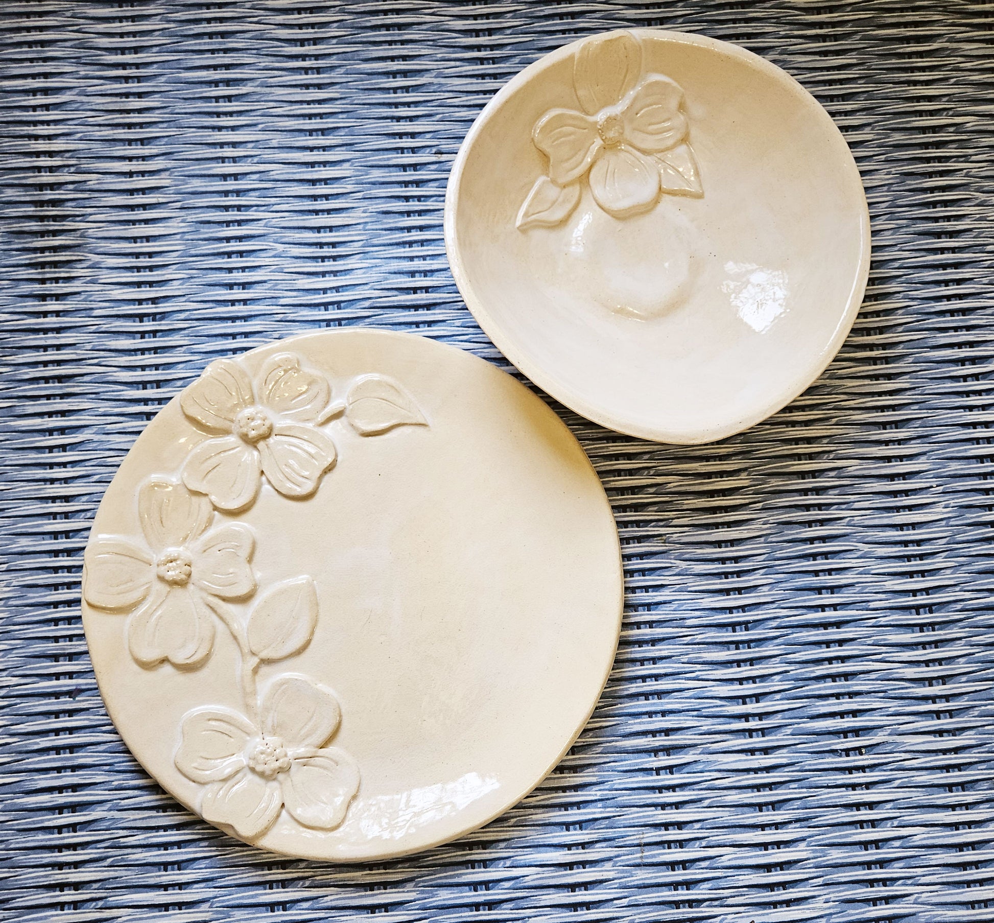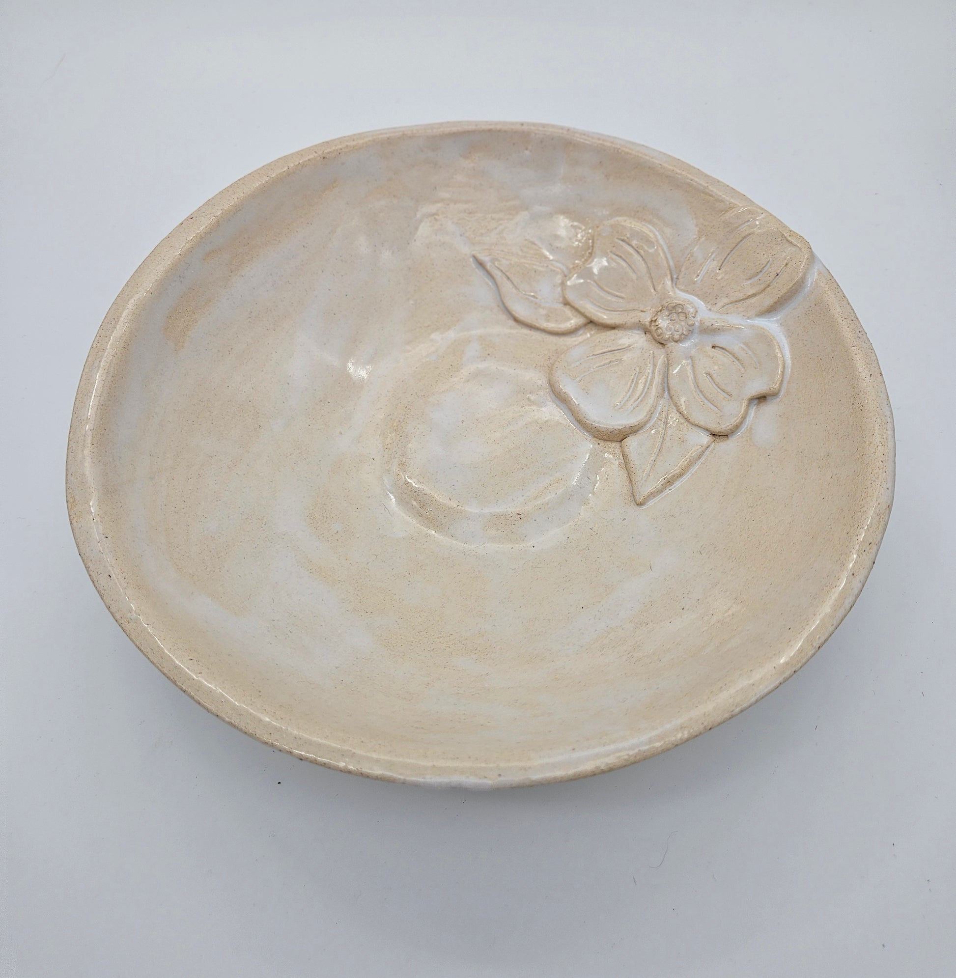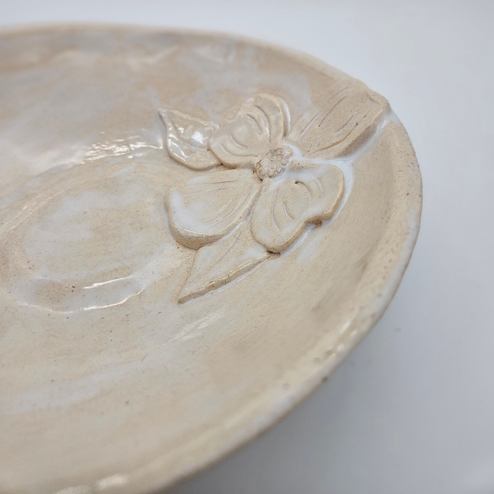 Dogwood Days Bowl is a unique artisan collectible. This beautiful hand built stoneware bowl is approximately 10" in diameter and 2.5" deep. Glazed in white pearl. The color has a slight beige hue with lighter white in the nooks and crannies.