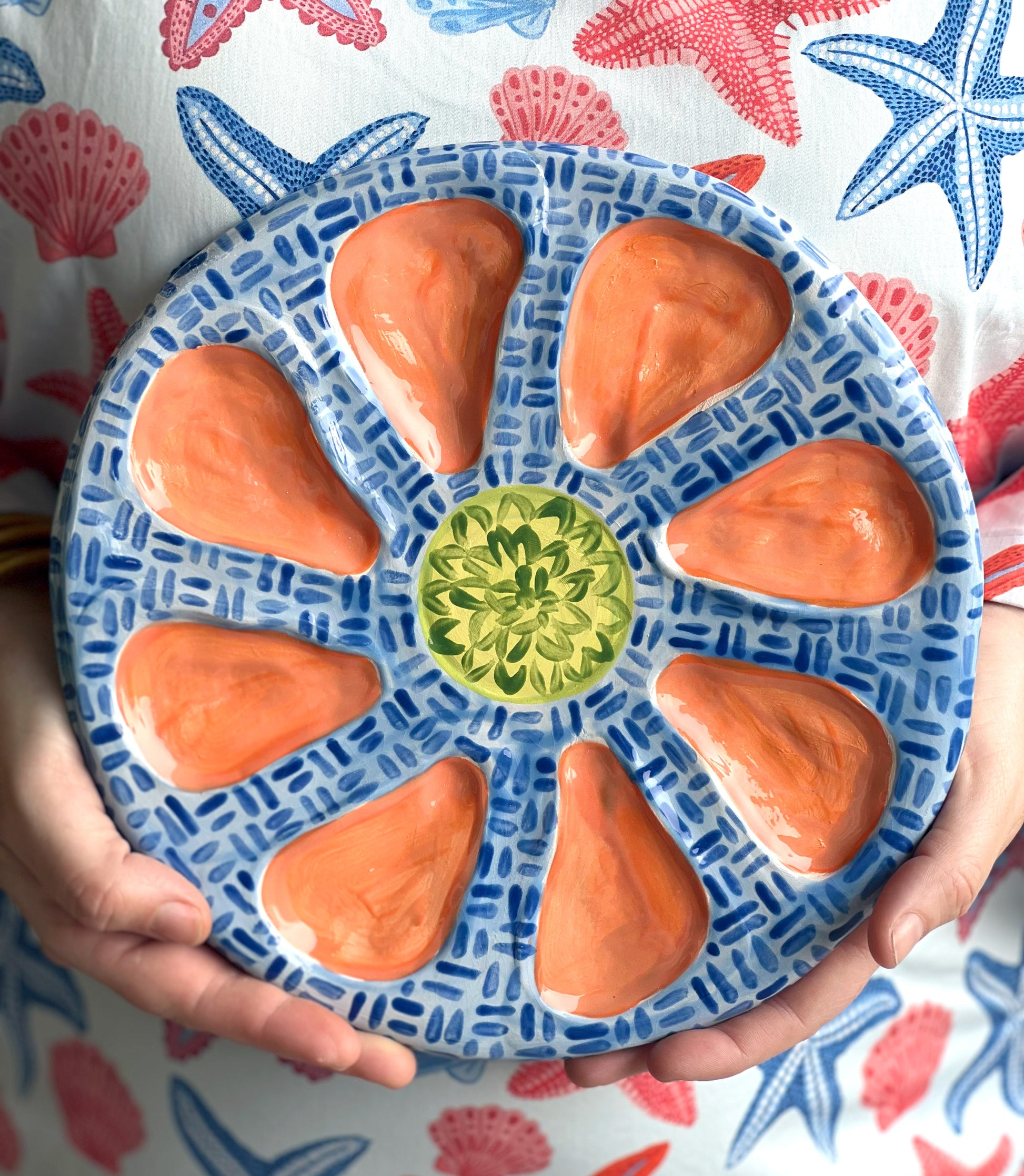 Blue and orange oyster plate with our crosshatch design and green center is a unique artisan collectible. This beautiful hand built stoneware oyster plate is between 8" and 9” in diameter, depending on clay shrinkage during drying.