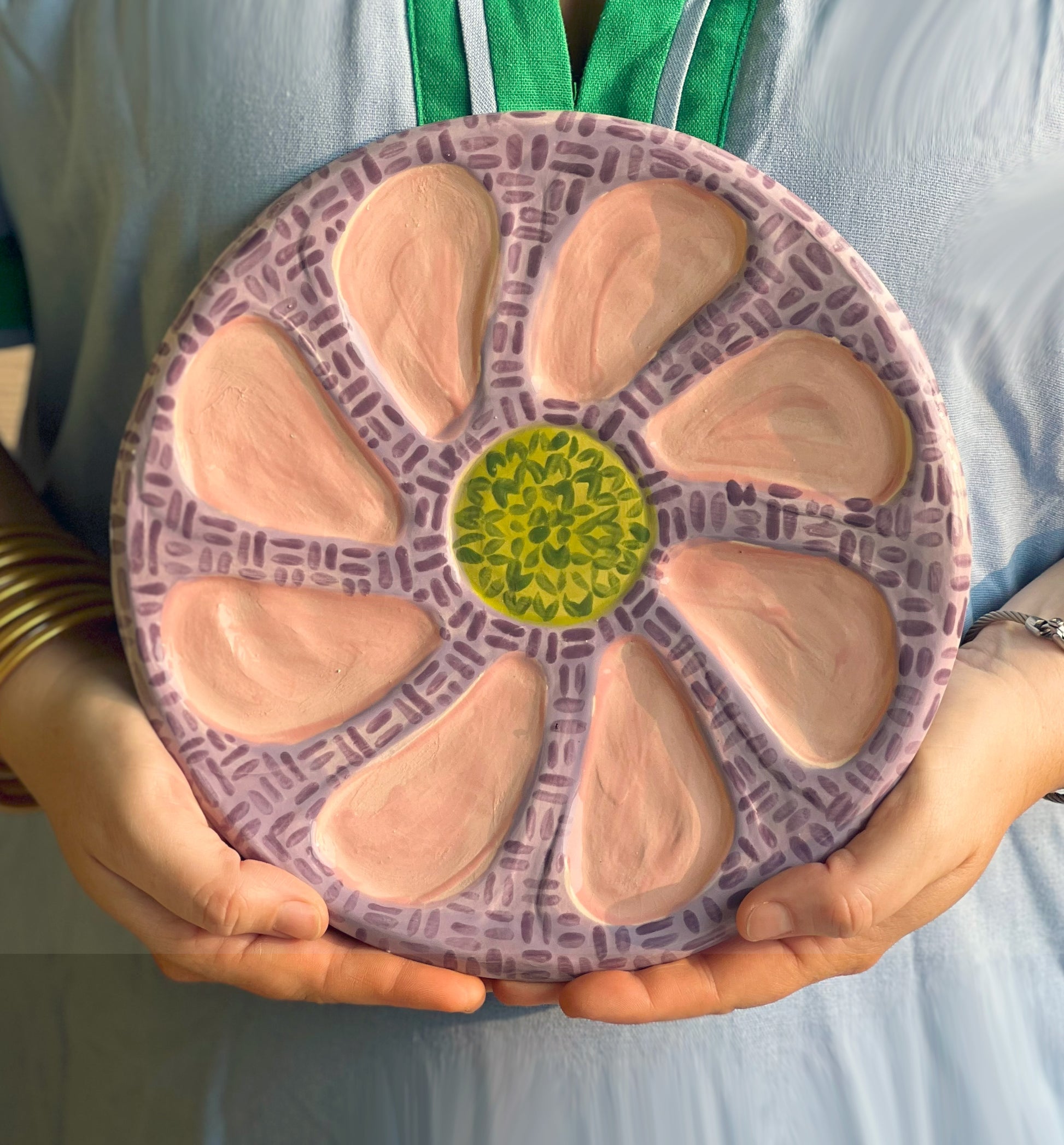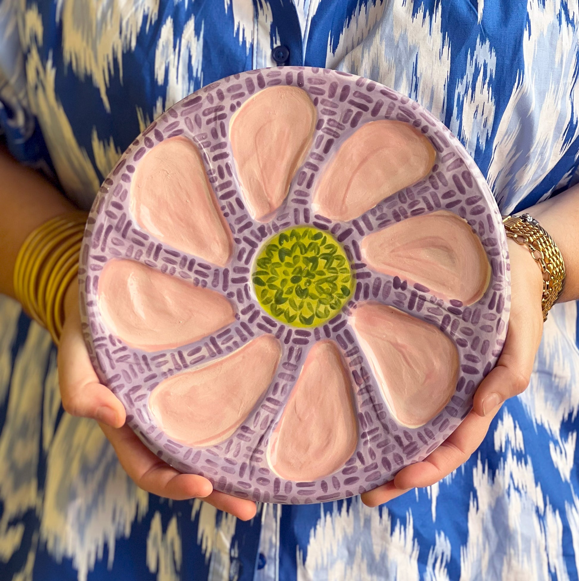 Lavender and pink oyster plate with our crosshatch design and green center is a unique artisan collectible. This beautiful hand built stoneware oyster plate is between 8" and 9” in diameter, depending on clay shrinkage during drying.