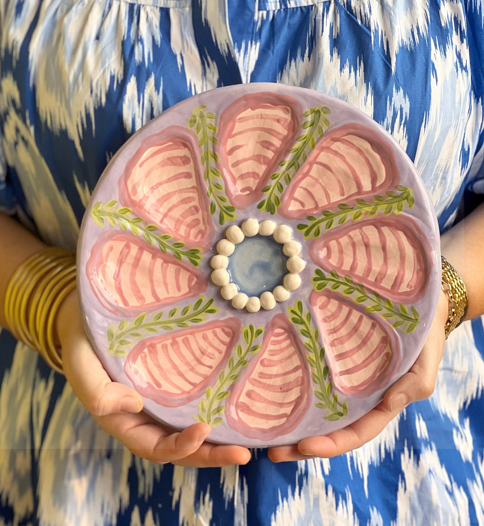 Lavender and pink oyster plate with beaded pearl styled center is a unique artisan collectible. This beautiful hand built stoneware oyster plate is 8" to 9" in diameter (final size varies depending on clay shrinkage during firing).