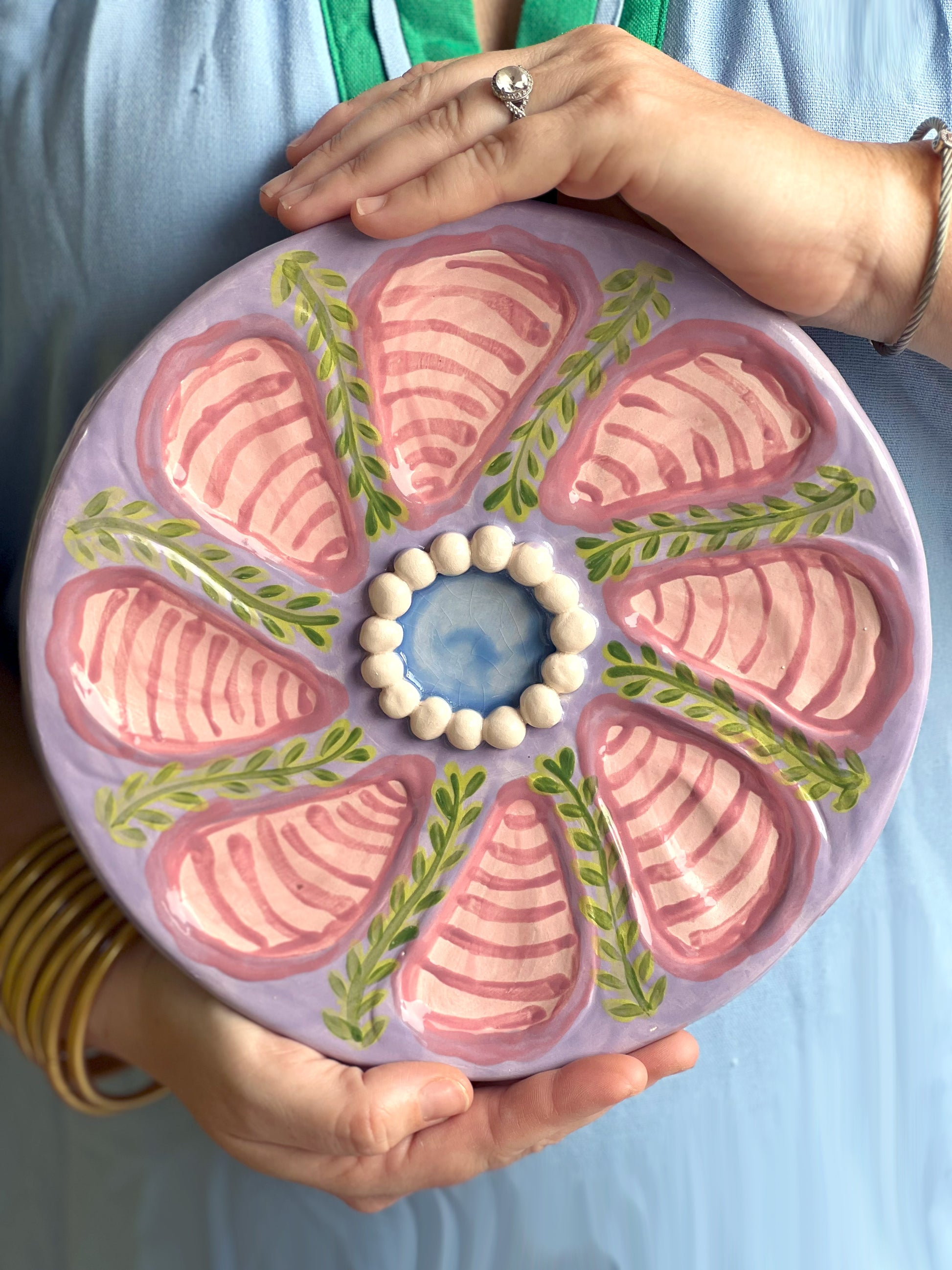 Hand Built Oyster Plate 9" in Lavender and Pink with Beaded Center