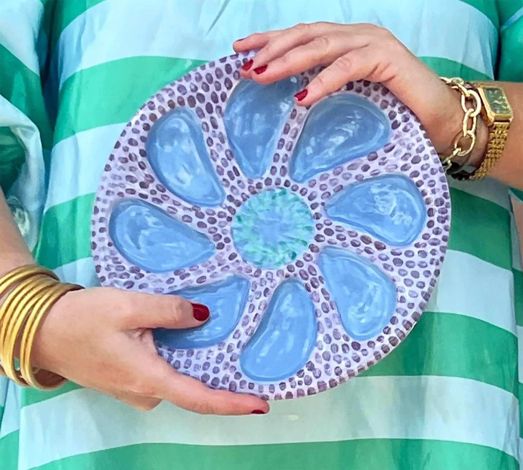 Lavender accented accented oyster plate is a unique artisan collectible. This beautiful hand built stoneware oyster plate is between 8" and 9” in diameter, depending on clay shrinkage during drying.