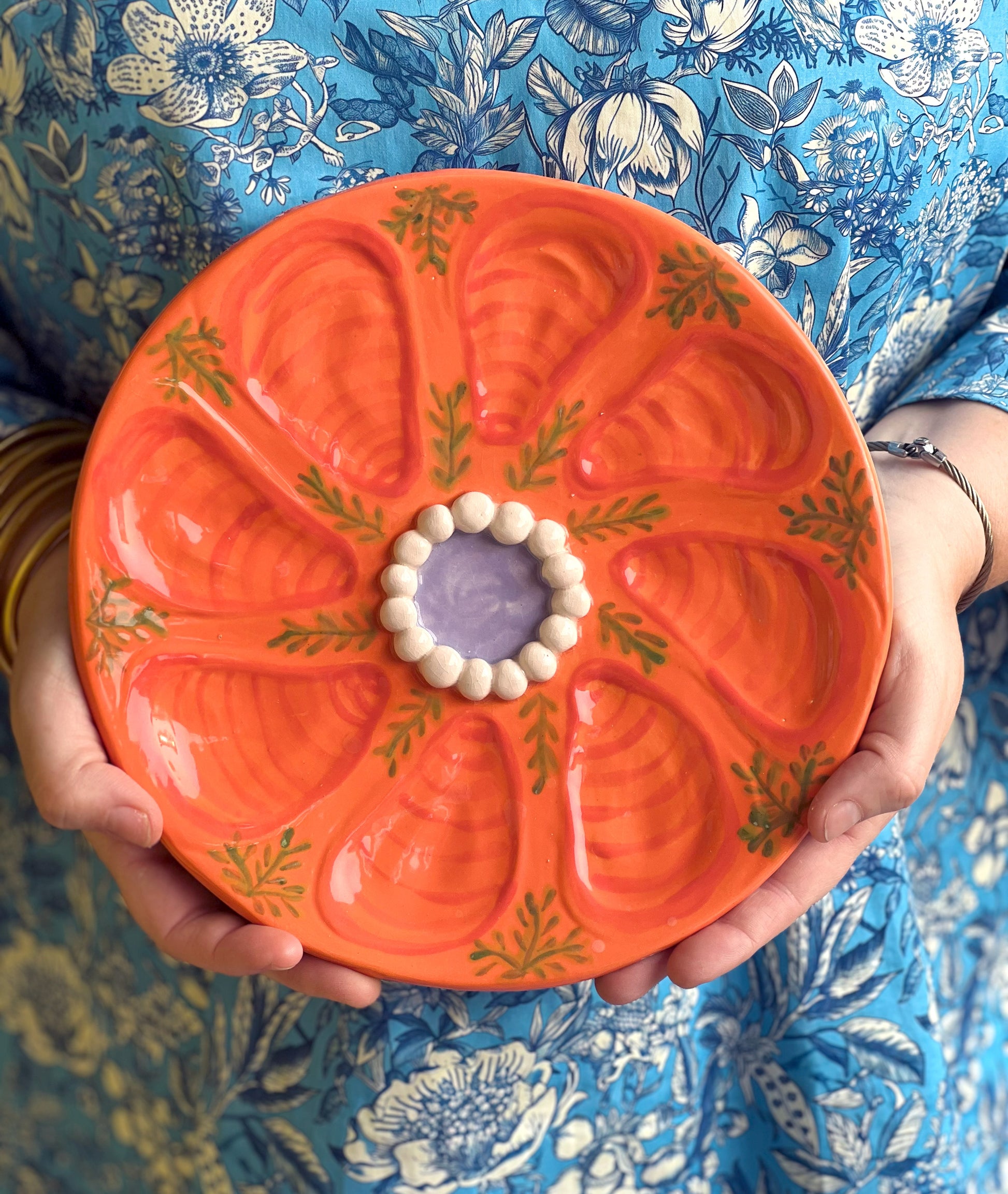 Hand Built Oyster Plate 9" in Orange and Green with Beaded Center