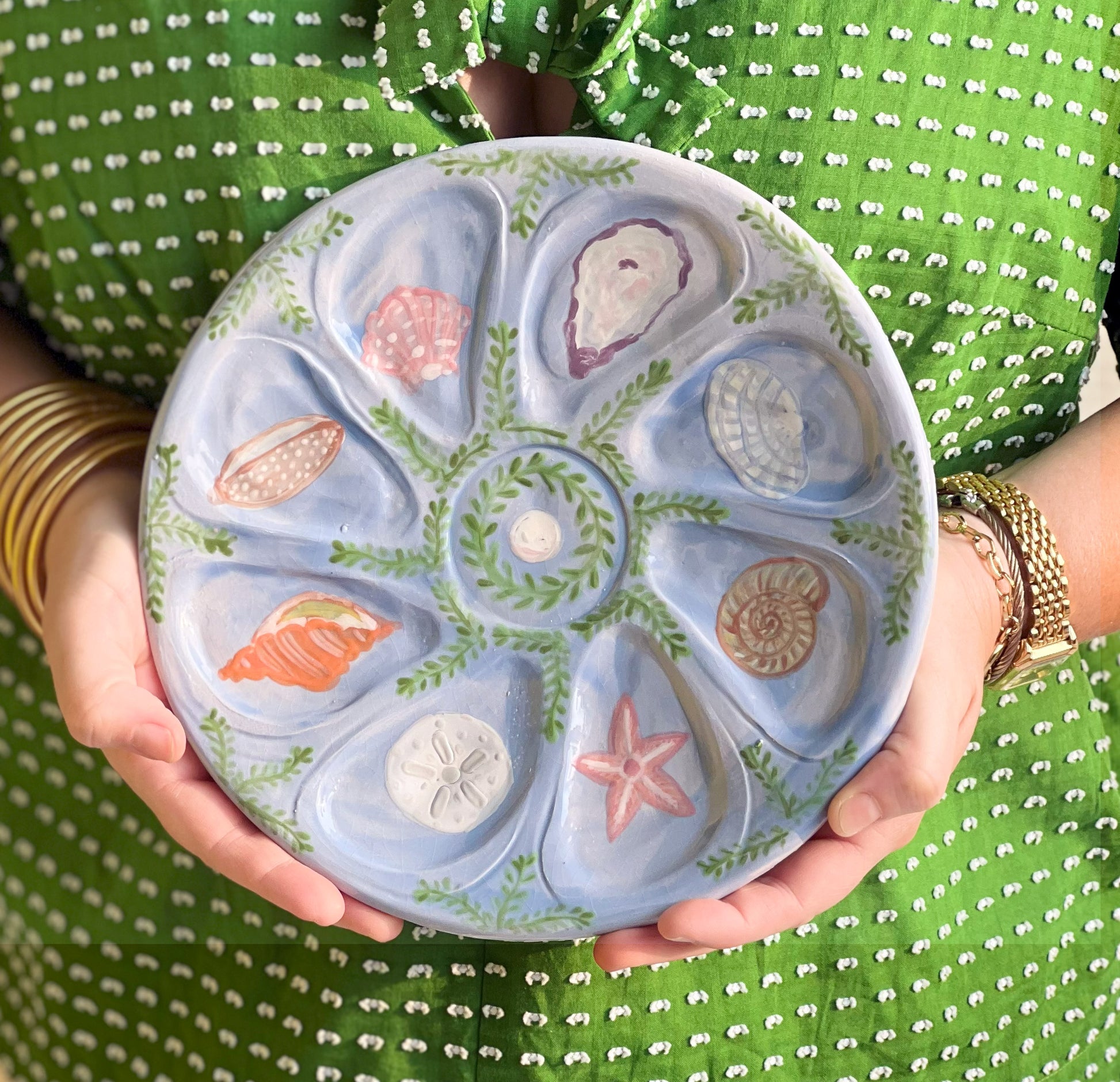 Beautiful pale blue oyster plate with hand painted seashells in each well.
