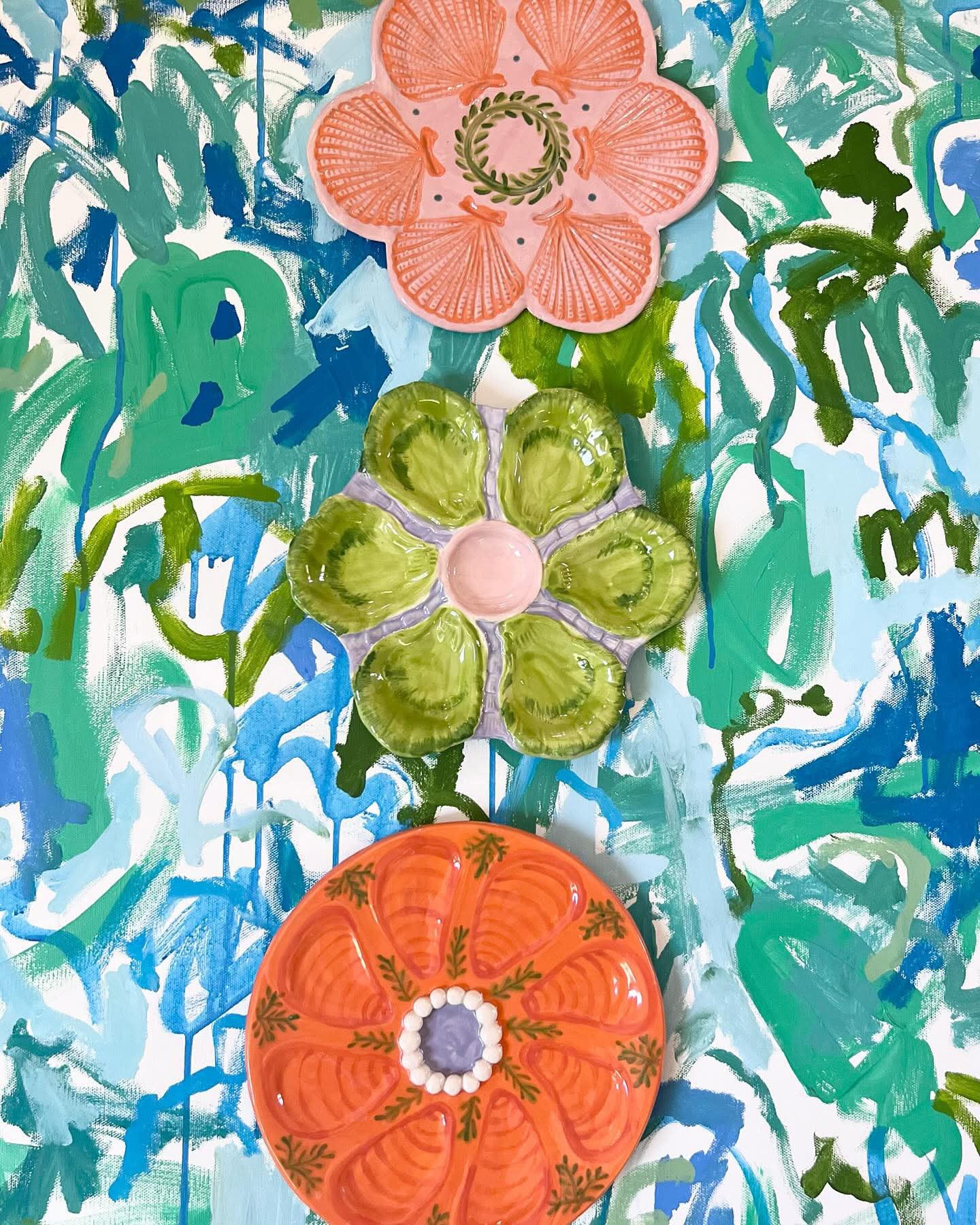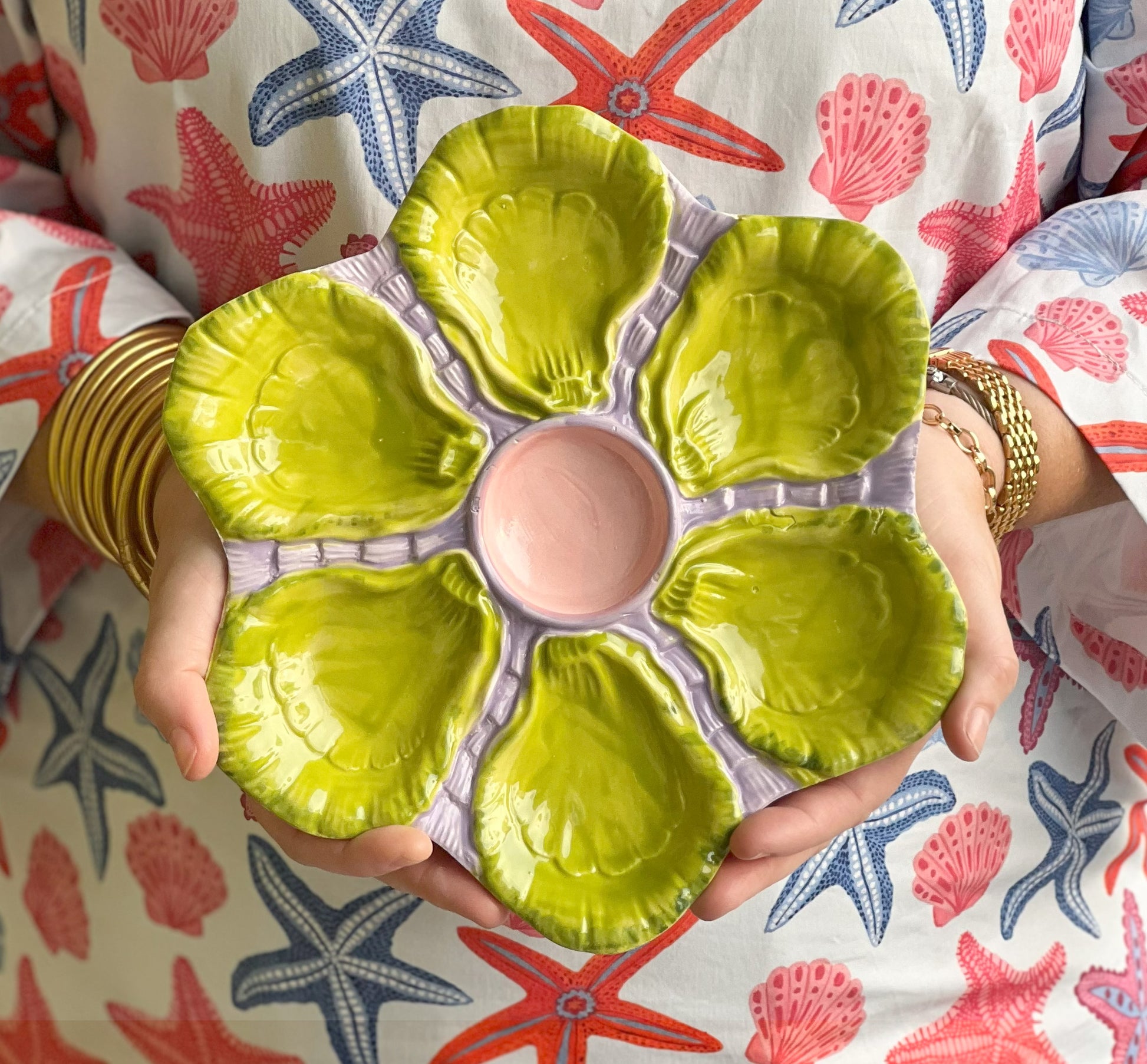 Hand Painted Cast Oyster Plate - Lavender and Chartreuse
