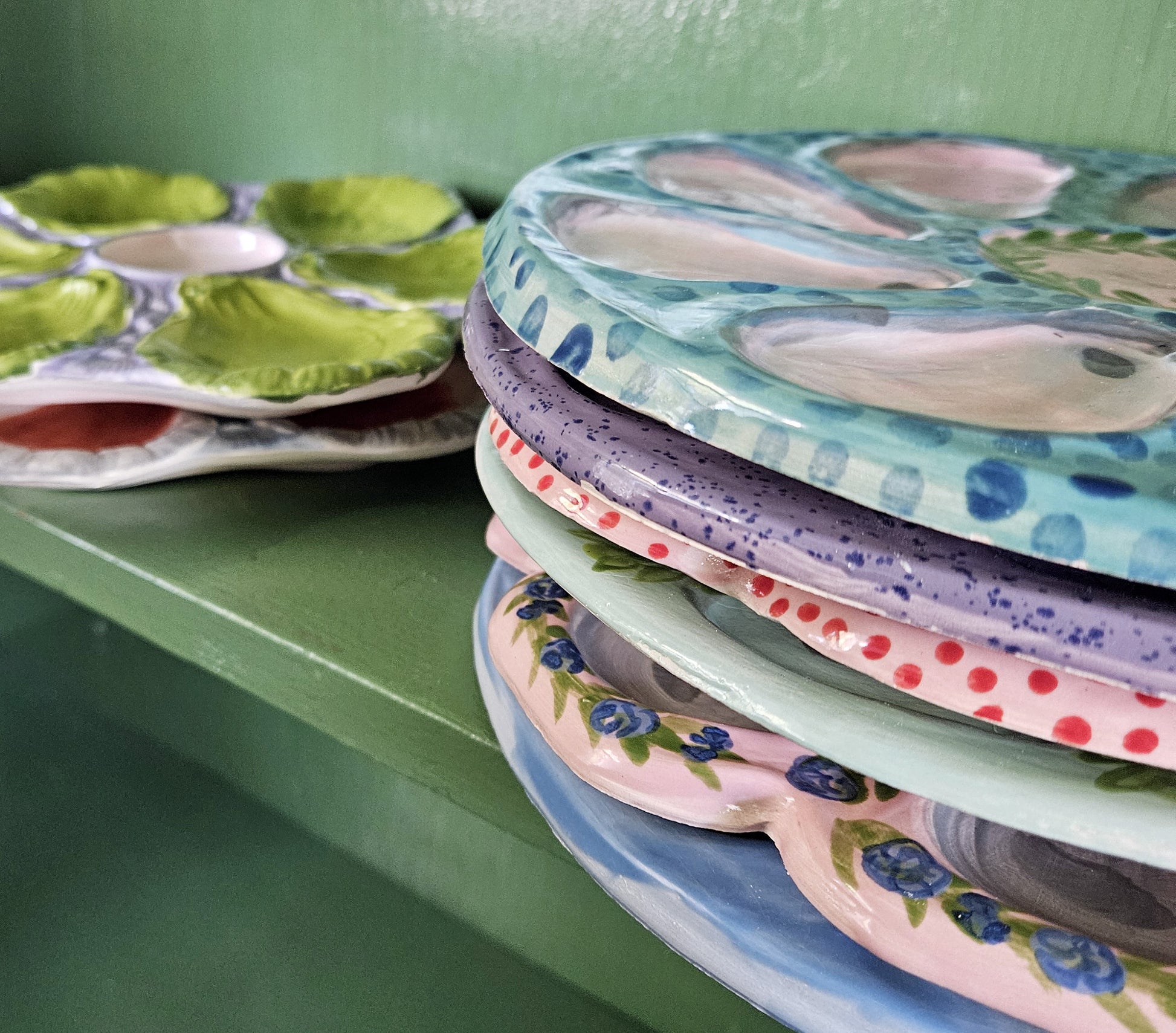 Blue/gray, orange, and green hand painted oyster plate is a unique collectible. We individually slip cast each plate in our studio, glaze, then kiln fire to a lustrous heirloom finish. This beautiful oyster plate is between 8" and 9” in diameter, depending on clay shrinkage during drying.
