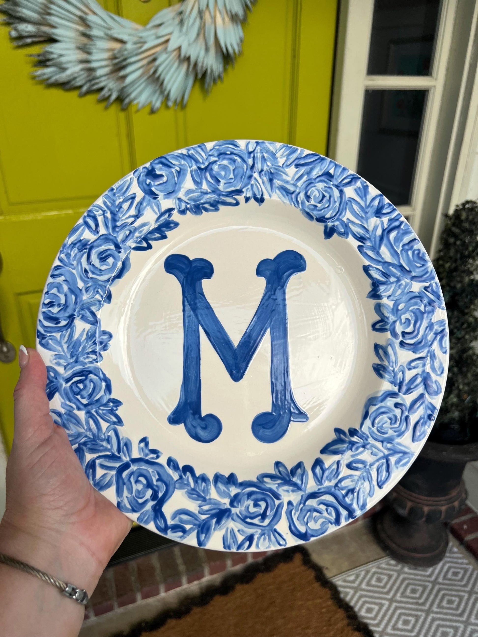 All our collectible plates are hand painted to order. This design can be customized with a single, double, or triple letter monogram. See our guidelines for entering monogram letters.