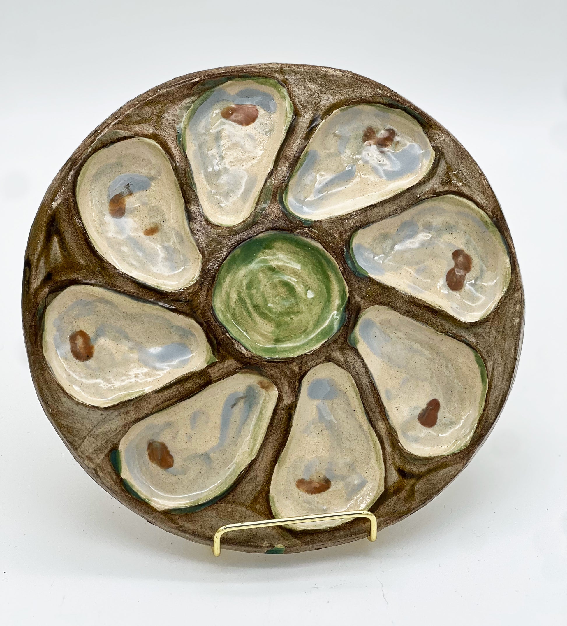 Oyster Plate in a soft brown glaze with medium green center and color accents. Oyster shell wells are a pale bluish grey with grown spots