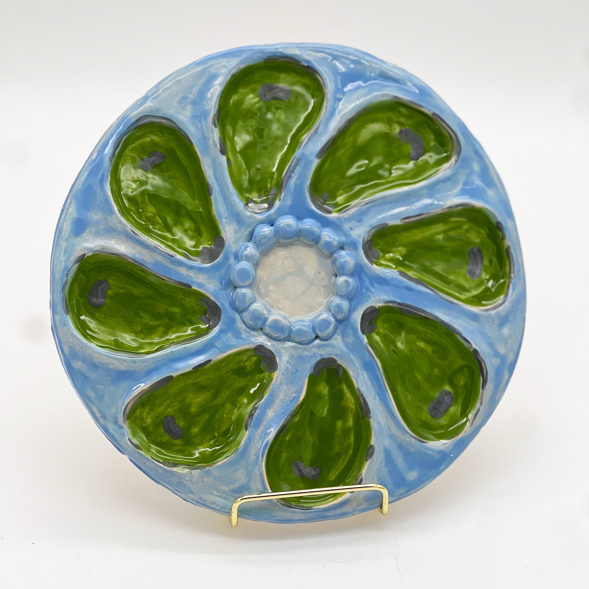 Oyster Plate in Blue and Green with Beaded Center. Distinctive artisan pottery.