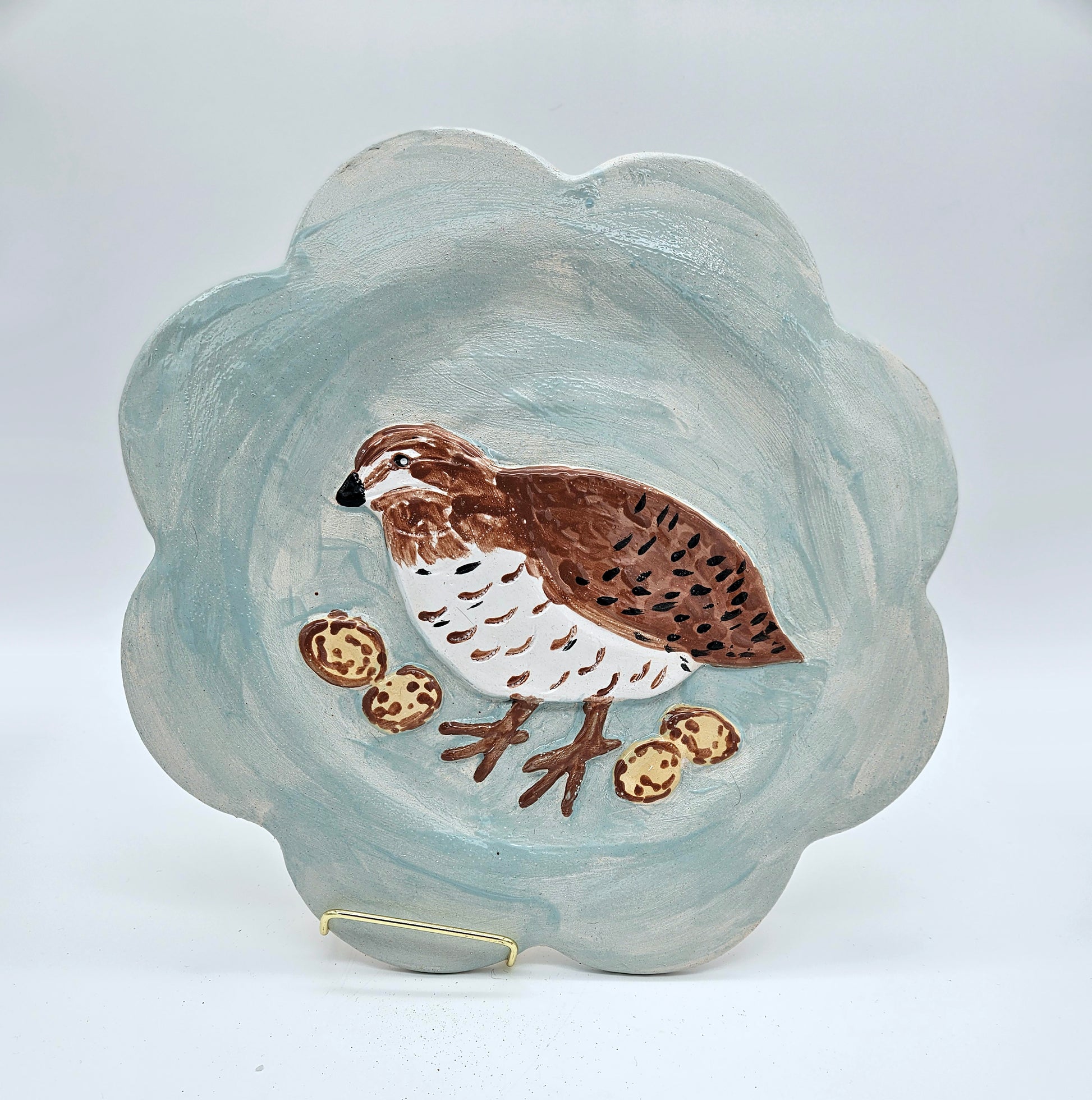 Scalloped plate with quail and eggs is a unique artisan collectible. This handbuilt stoneware plate is approximately 11" in diameter. This piece is glazed in robin's egg blue and the raised, sculpted, textured quail is hand painted in brown, white, and black.